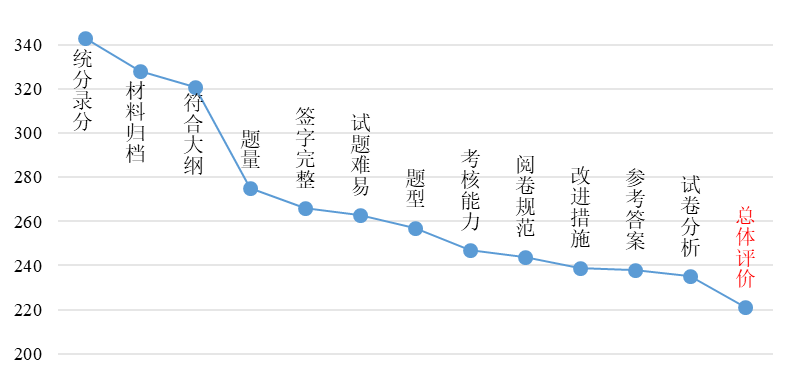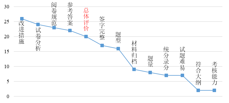 2.平时成绩与试卷评阅不规范。表现为平时成绩依据较单一、给分偏高,个别没有平时成绩登记表,平时成绩依据缺失;参考答案得分点不够明确,个别没有参考答案,评分缺少依据;阅卷没有扣分标记。据统计,有107次提到“平时成绩”,39次提到“参考答案”,30次提到“评分细则”,29次提到“评分标准”。